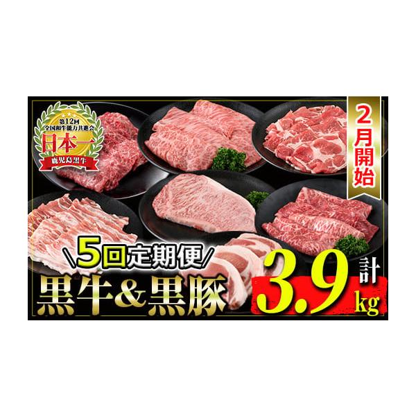 [5回定期便・11月発送開始]鹿児島黒牛・黒豚定期便(総量3.9kg) 国産 鹿児島 黒豚 豚 豚肉 ロース 豚カツ トンカツ しゃぶしゃぶ 小分け 冷凍 冷凍便 ステーキ サーロイン すき焼き 牛 牛肉 肉 ウデ スライス 赤身 霜降り カタロース[JA北さつま]